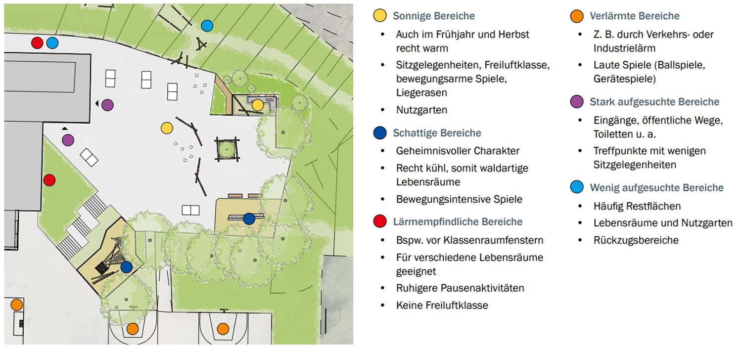 - Wie können wir das Schulgelände so gestalten, dass Ruhe-, Bewegungs- und Naturzonen entstehen?