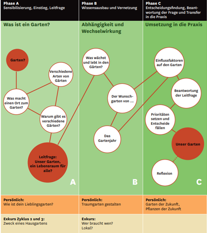 Das Schulareal wird zu einem Ort, an dem Unterrichtswissen sichtbar und erfahrbar wird. So werden beispielsweise mathematische Berechnungen zur Planung von Blumenbeeten angestellt, biologische Prozesse beobachtet, jahreszeitliche Veränderungen mit digitalen Tools erfasst oder Texte auf Grundlage der gemachten Erfahrungen geschrieben (Kompetenz: Fähigkeit zur Zusammenarbeit und Kommunikation). Interdisziplinarität führt zur Ausbildung von überfachlichen Kompetenzen wie Verantwortungsbewusstsein, Zusammenarbeit und Problemlösungskompetenz bei komplexen Fragestellungen (Kompetenzen: Fähigkeit zur Partizipation, zur Zusammenarbeit und zur Übernahme von Verantwortung).