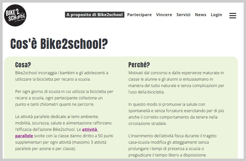 La piattaforma contiene una guida per le scuole che fornisce informazioni preziose su come queste possono essere rese amiche della bicicletta in modo semplice e passo dopo passo. Inoltre, ci sono varie offerte come clevermobil, safety tool o una scelta di opuscoli e materiali didattici sulla mobilità. Inoltre, ci sono consigli su come i bambini possono andare a scuola nel modo più indipendente possibile a piedi, con dispositivi simili ai veicoli o in bicicletta.Bike2school (Pro Velo Svizzera, 2° e 3° ciclo e Sec II)
