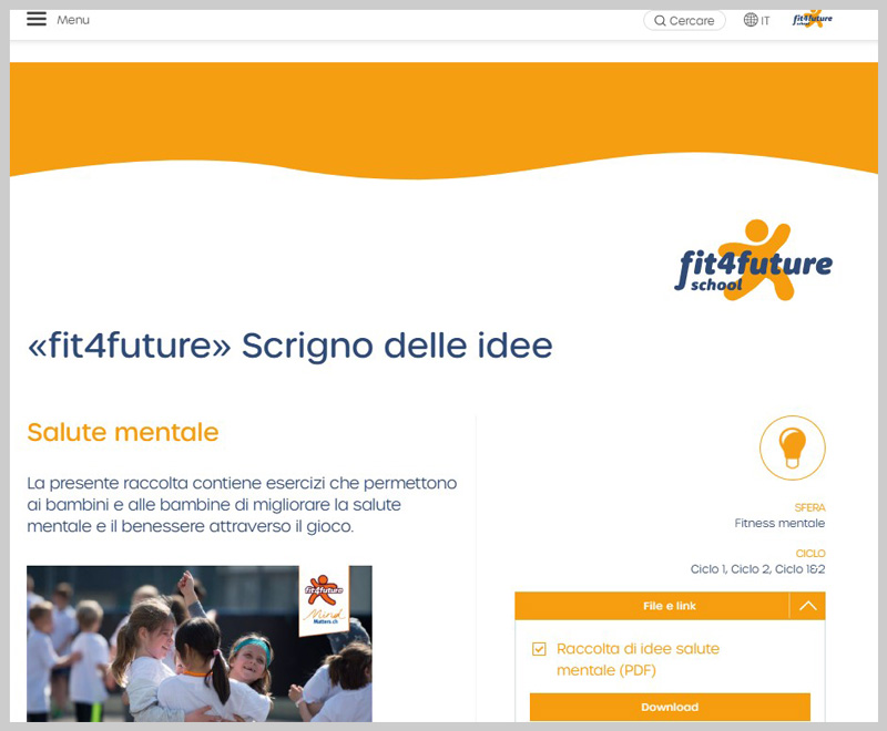 La pagina dedicata alla scuola di Promozione Salute Svizzera fornisce informazioni per insegnanti e genitori. Contiene opuscoli, materiale didattico e schede di esercizi su vari argomenti relativi alla salute, compreso il movimento. Infografiche e video, in particolare sulla nutrizione e l'attività fisica, sono disponibili anche qui.Prendi la bici e per andare a scuola (piattaforma d'informazione di bici+scuola, per tutti i cicli)