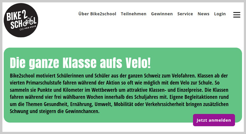 Das Velo, das Verkehrsmittel der Zukunft? Entdecke mit deiner Klasse das Velo in den vier Bereichen: Transportmittel, Sicherheit, Mechanik, Gesundheit und Klima. Auf der Webseite befindet sich direkt umsetzbares Unterrichtsmaterial für den Zyklus 3.Nimms's Velo und fahr in die Schule (Informationsplattform von schule + velo für alle Zyklen)