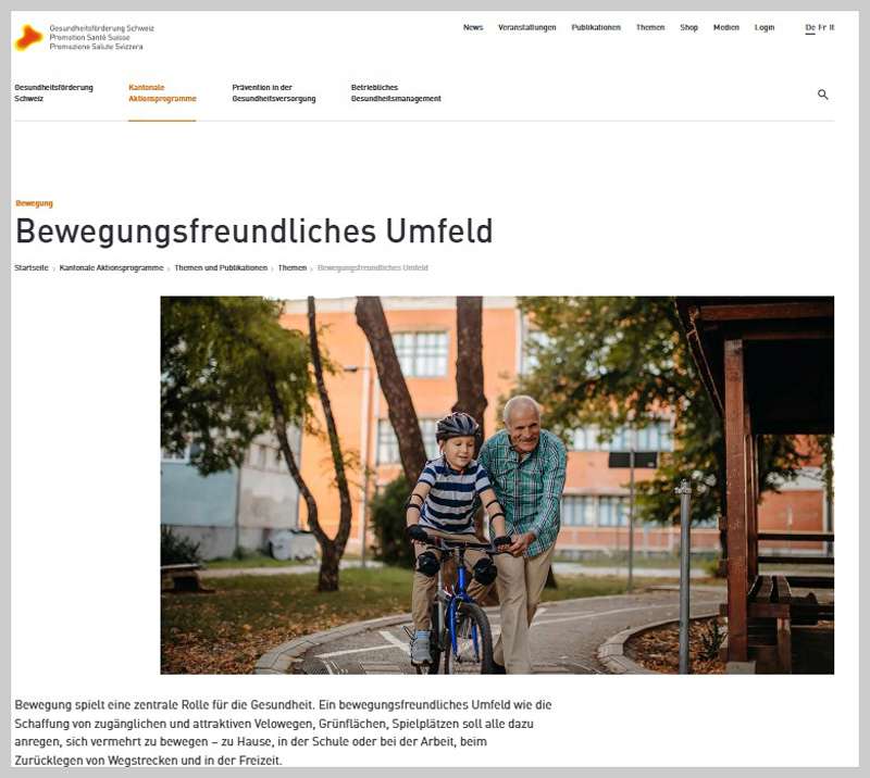 Die Webseite Gesundheitsförderung Schweiz bietet im Setting Schule Informationen für Lehrpersonen und Eltern. Sie enthält Broschüren, Unterrichtsmaterialien und Übungskarten zu verschiedenen gesundheitsrelevanten Themen, darunter auch Bewegung. Infografiken und Videos, insbesondere zu Ernährung und Bewegung, sind hier abrufbar.DEFI VELO (Zyklus 3)