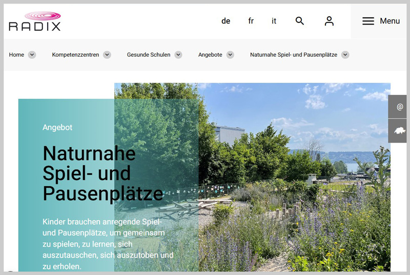 Auf der Informationsplattform finden sich ein Leitfaden, welcher wertvolle Hinweise gibt, wie Schulen einfach und schrittweise velofreundlich gestaltet werden können. Dazu kommen verschiedene Angebote wie clevermobil, Safety Tools oder Lernmedien zu Mobilität. Des Weiteren gibt es Tipps, wie Kinder den Weg zur Schule möglichst selbständig zu Fuss, mit fahrzeugähnlichen Geräten oder mit dem Velo zurücklegen können.Naturnahe Spiel- und Pausenplätze (Zyklus 1 und 2)