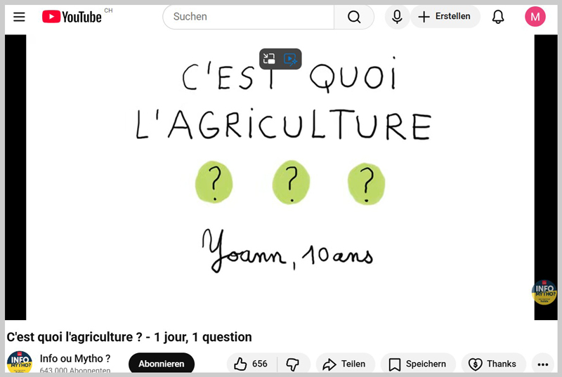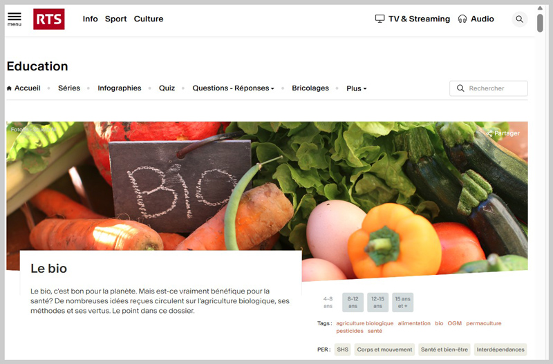L’école à la ferme est un apprentissage qui met à contribution les cinq sens. En accueillant les enfants des écoles sur leur exploitation, les familles paysannes offrent un enseignement qui sollicite des facultés et des ressources nouvelles. 360 prestataires de L’école à la ferme partout en Suisse pour entrer en contact direct avec la vie de la ferme et connaître l’origine de notre nourriture.Une assiette saine ET durable? (Biovision et L'éprouvette)