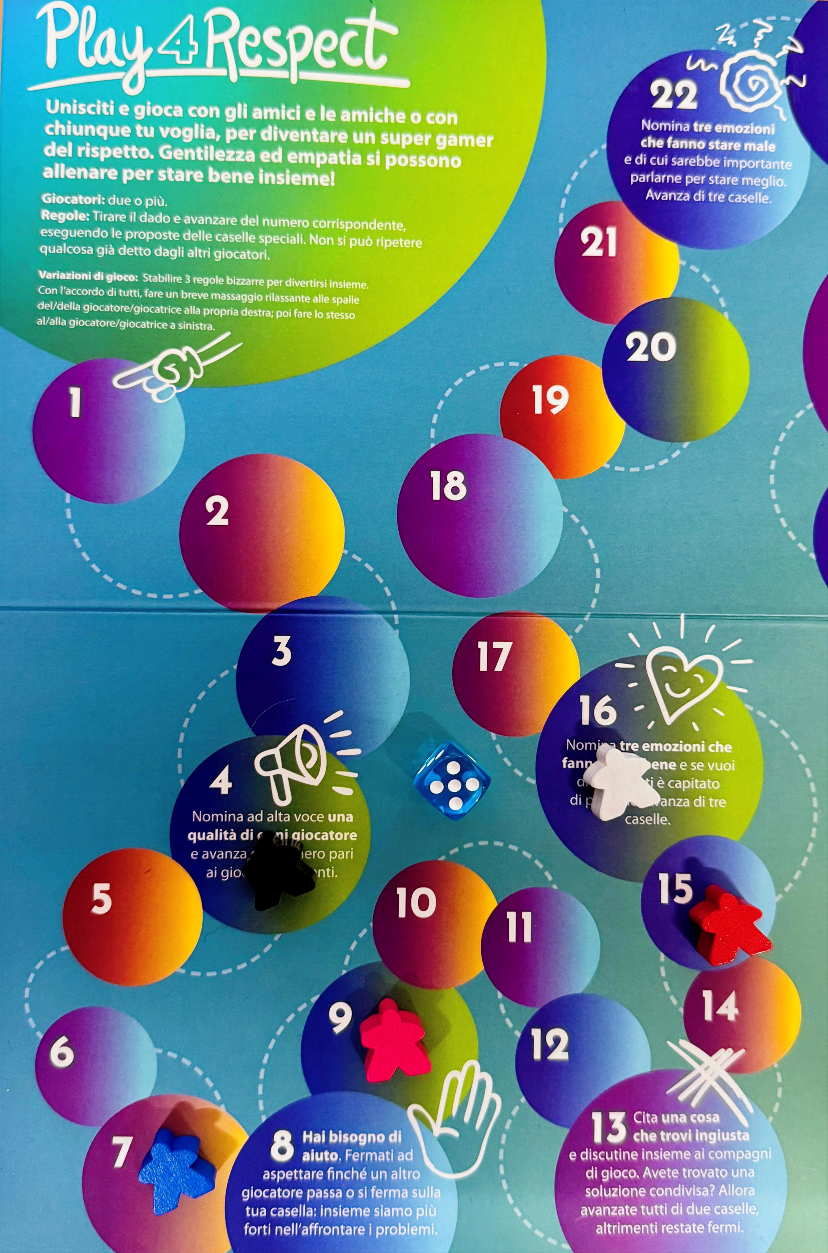 Gioco educativo che invita le allieve, gli allievi e le persone in formazione a riflettere sulle dinamiche relazionali, sulla socializzazione e sul benessere individuale e collettivo. Attraverso situazioni di gioco e momenti di confronto, stimola lo sviluppo di competenze sociali fondamentali come la gentilezza, l’empatia, la partecipazione e la collaborazione, favorendo un clima di rispetto reciproco e di ascolto.