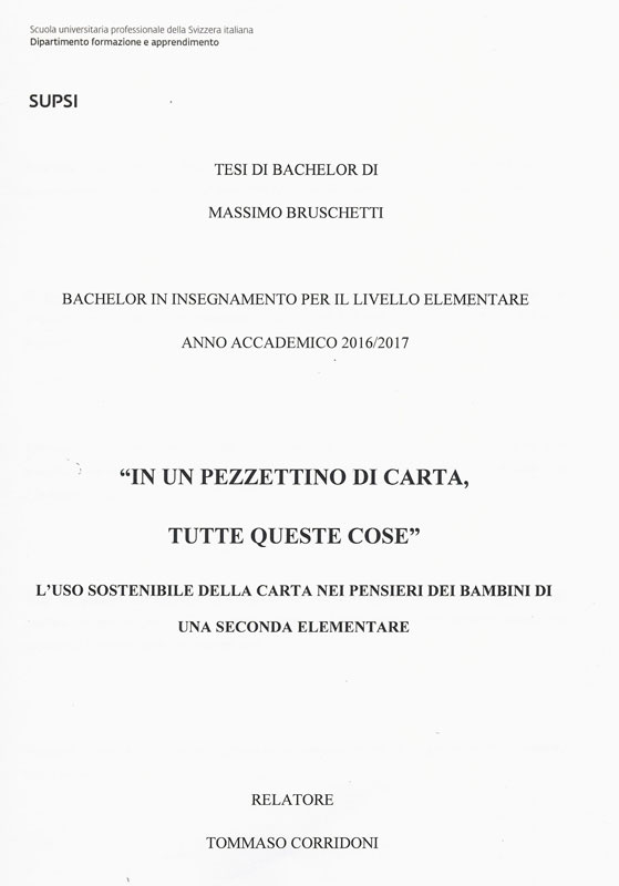 Questo lavoro di Bachelor presenta un percorso sulla carta e il suo consumo pensato in un’ottica di sviluppo sostenibile con l’obiettivo di favorire la costruzione di un pensiero sostenibile in un bambino di seconda elementare. Basandosi su diverse esperienze svolte dai bambini sul riutilizzo e il riciclo della carta e ad uno sguardo su come viene fatta e come si smaltisce, l’insegnante ha potuto raccogliere le concezioni dei bambini sul ciclo di vita della carta e osservarne quantitativamente e qualitativamente l’evoluzione. Al termine del lavoro la docente giunge alla conclusione che “Gli allievi hanno dimostrato un profilo di competenze ESS. La dimensione economica si definisce nell’interesse del prodotto finito; la dimensione ambientale emerge dalla sensibilità nei confronti della natura; la dimensione sociale appare dalla consapevolezza che la natura è di tutti e che il messaggio sostenibile deve essere trasmesso alla popolazione.” Per estendere l’analisi all’intero I ciclo, l’itinerario didattico è stato svolto anche in una sezione di Scuola dell’Infanzia (SI). Il confronto dei risultati mostra che gli allievi di SE e di SI sviluppano le medesime competenze di ESS, ma in maniera differente: i bambini di SE si pongono problemi valoriali sullo spreco, mentre quelli di SI sono maggiormente legati alle tecniche e alle percezioni fisiche della carta.