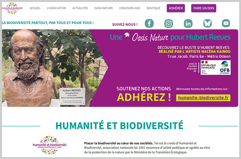 Humanité et biodiversité est une association française et un portail portés par Hubert Reeves. Le site contient des articles, des possibilités d’échanger, des idées pour créer des Oasis Nature, des informations sur la biodiversité, son importance en tant que telle, pour la santé, pour le patrimoine naturel, … ainsi que des textes institutionnels (France, international).Sauver le climat … sans menacer la biodiversité / cycles 3, sec II