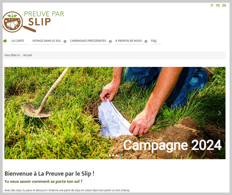 Ce projet de science citoyenne a été lancé le 7 avril 2021 par la station fédérale Agroscope et l'Université de Zurich. "La preuve par le slip" vise à déterminer la qualité des sols à l'échelle nationale en enterrant des sous-vêtements pendant deux mois. Des slips en coton seront ainsi distribués aux personnes intéressées à participer à l'expérience. L’objectif est de faire un relevé systématique de l’état de santé du sol. Le matériel doit être enterré dans le champ, la prairie ou le jardin. Au bout de deux mois, il faut le déterrer. Plus la décomposition est avancée, plus les organismes vivants dans le sol sont actifs et plus le sol est sain, c’est du moins l’hypothèse qu’il s’agit de vérifier dans le projet.Mission B / cycles 1, 2, 3, sec II