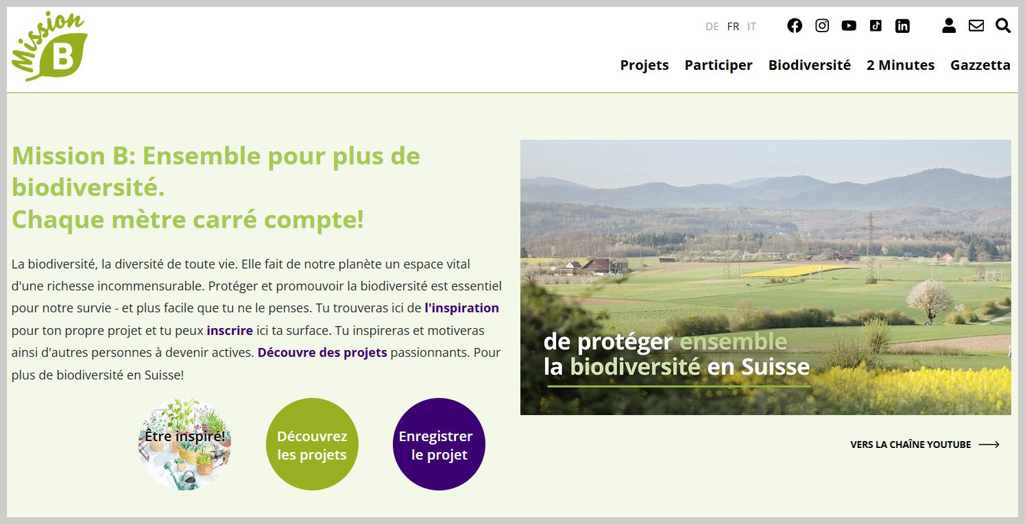 L'opération « Mission B » est une réponse à la perte continue de biodiversité. Le plan B pour l’environnement. Chaque seconde, la Suisse perd 0,7 mètre carré d’espace vert. Les insectes meurent, les populations d’oiseaux déclinent. Le projet commun de SRF, RSI, RTR et RTS a pour but d’encourager durablement la biodiversité en Suisse. Conseils et informations, également adapté aux écoles.Les parcs suisses / cycles 1, 2, 3, sec II