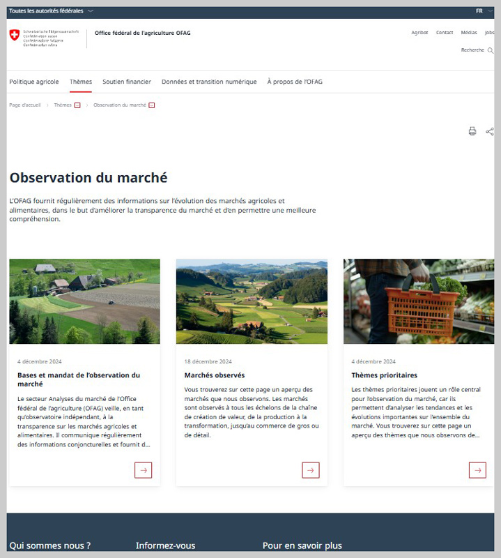 Vue d'ensemble de la situation en Suisse à l'aide de tableaux, graphiques, publications, communiqués de presse, etc. On y aborde notamment les revenus et dépenses des ménages, l'endettement, les perspectives macroéconomiques, etc.Observation du marché (Office fédéral de l'agriculture)