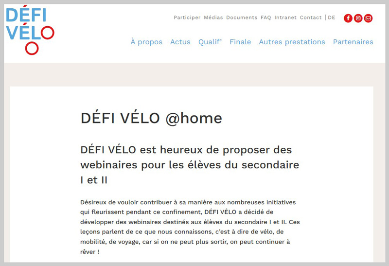 Défi Vélo est une compétition inter-écoles qui vise à faire (re)découvrir aux 15-20 ans le plaisir de la petite reine par l’action et le jeu, tout en les sensibilisant à la sécurité routière.Toute la classe à vélo - (Cycles 2 et 3 - Sec II)