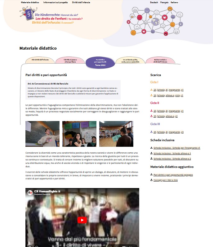 Il sito “Children’s Rights” propone una raccolta di materiali didattici gratuiti per le scuole di tutti i cicli, pensati per favorire la conoscenza e la comprensione della Convenzione ONU sui diritti dell’infanzia attraverso attività concrete e partecipative. Nella sezione “Diritti dell’infanzia” vi sono dei materiali complementari quali versioni semplificate e adatte alle e ai bambini della Convenzione in diverse varianti e approfondimenti informativi da poter utilizzare in classe. I contenuti, disponibili in più lingue, sono facilmente integrabili nella pratica didattica quotidiana e adatti sia come introduzione sia come approfondimento tematico.