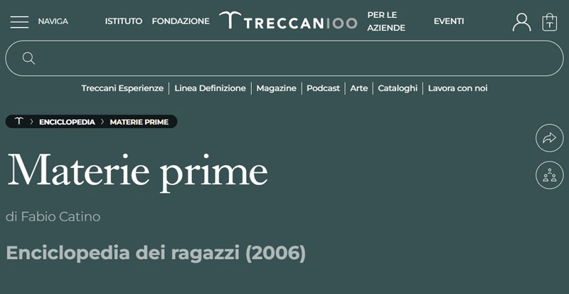 Ricercando "materie prime" si trovano diversi contributi sia televisi sia radiofonici attorno al tema. Dai sassi delle valli ticinesi al mercato globale delle materie prime.Materie prime - Enciclopedia dei ragazzi Treccani (2006)