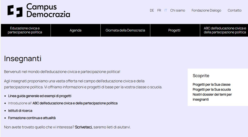 L'attenzione è sui valori democratici e il loro rapporto con le regole formali delle democrazie. Attualmente vi sono laboratori didattici che affrontano gli argomenti "diritto di partecipazione politica e voto" e "modalità decisionali: decisioni a maggioranza e democrazia diretta". I temi sono proposti in modo interattivo abbracciando riferimenti di natura storica, comparativa, pratica e personale..Informarsi, dibattere, partecipare, decidere (la gioventù dibatte)